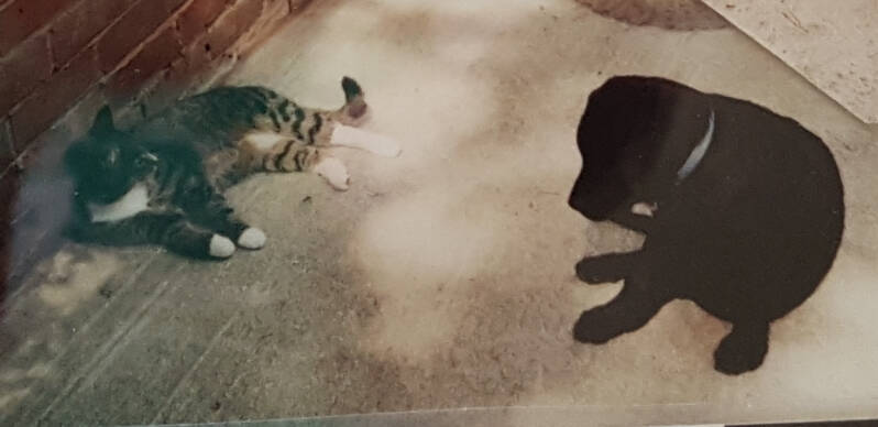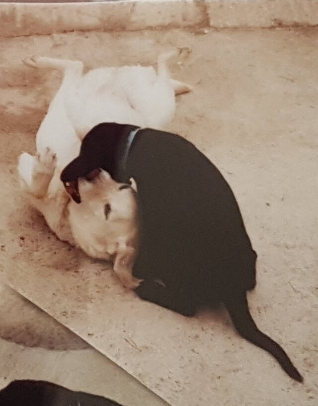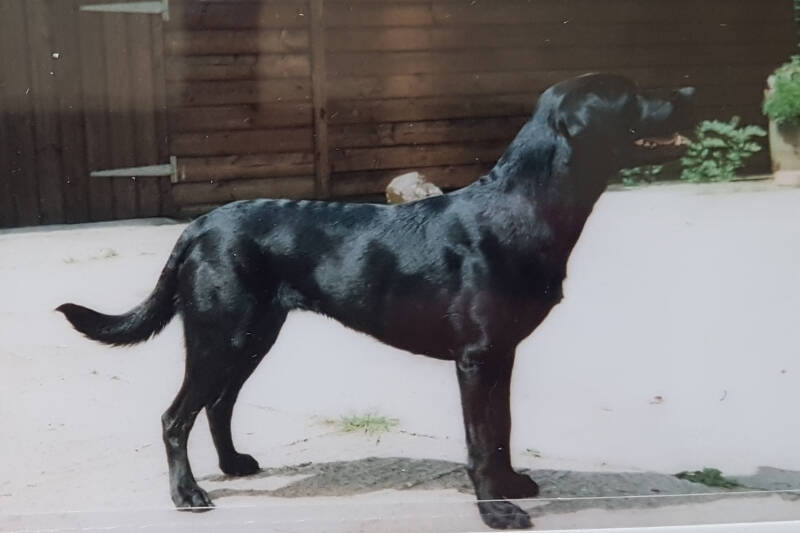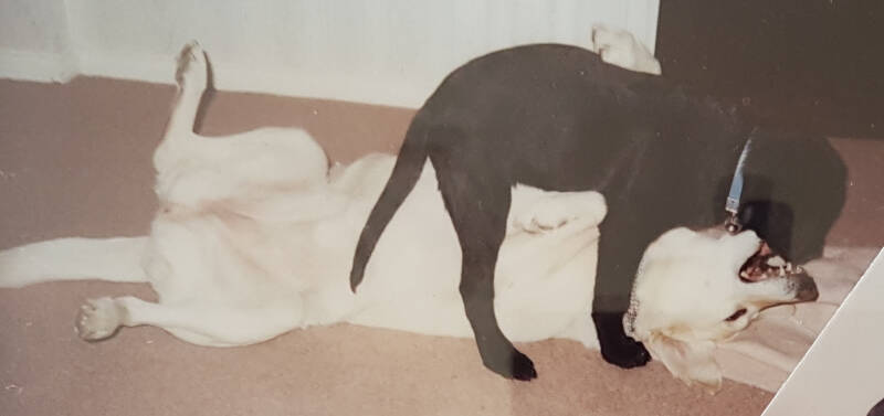 SCRUMPY was my first black labrador. Well, my first dog really. We already had an older labrador, called Cider, so Scrumpy seemed like a good name. She certainly lived up to it! And I was very ignorant. We arrived home with Scrumpy in the car, put her on the ground and brought Cider to meet her. Well, Scrumpy – 8 weeks old – had never seen a yellow dog. She’d only met black ones. She was straight under the car in fright. Coaxed her out fairly quickly, but poor little thing was terrified. She got over it very quickly though, and Cider – a very kind dog – quickly looked after her and played with her.